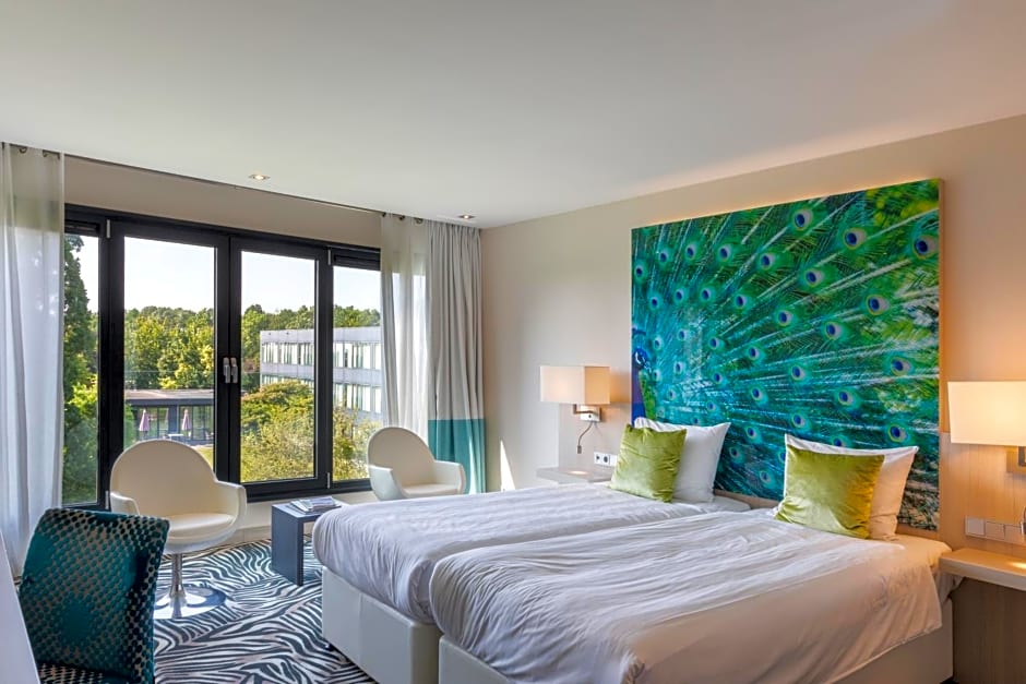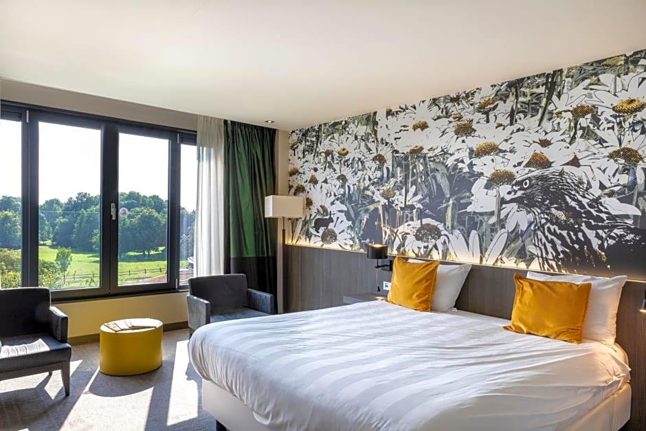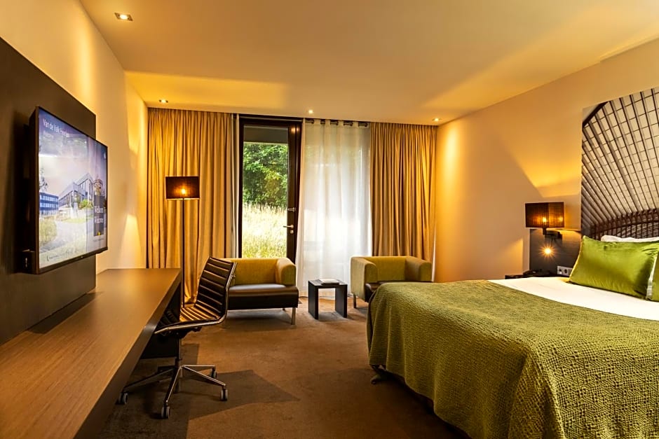 A spacious and modern room with a large bathroom. It is peacefully located. The bathroom includes a walk-in rain shower and a spa bath.